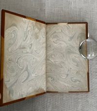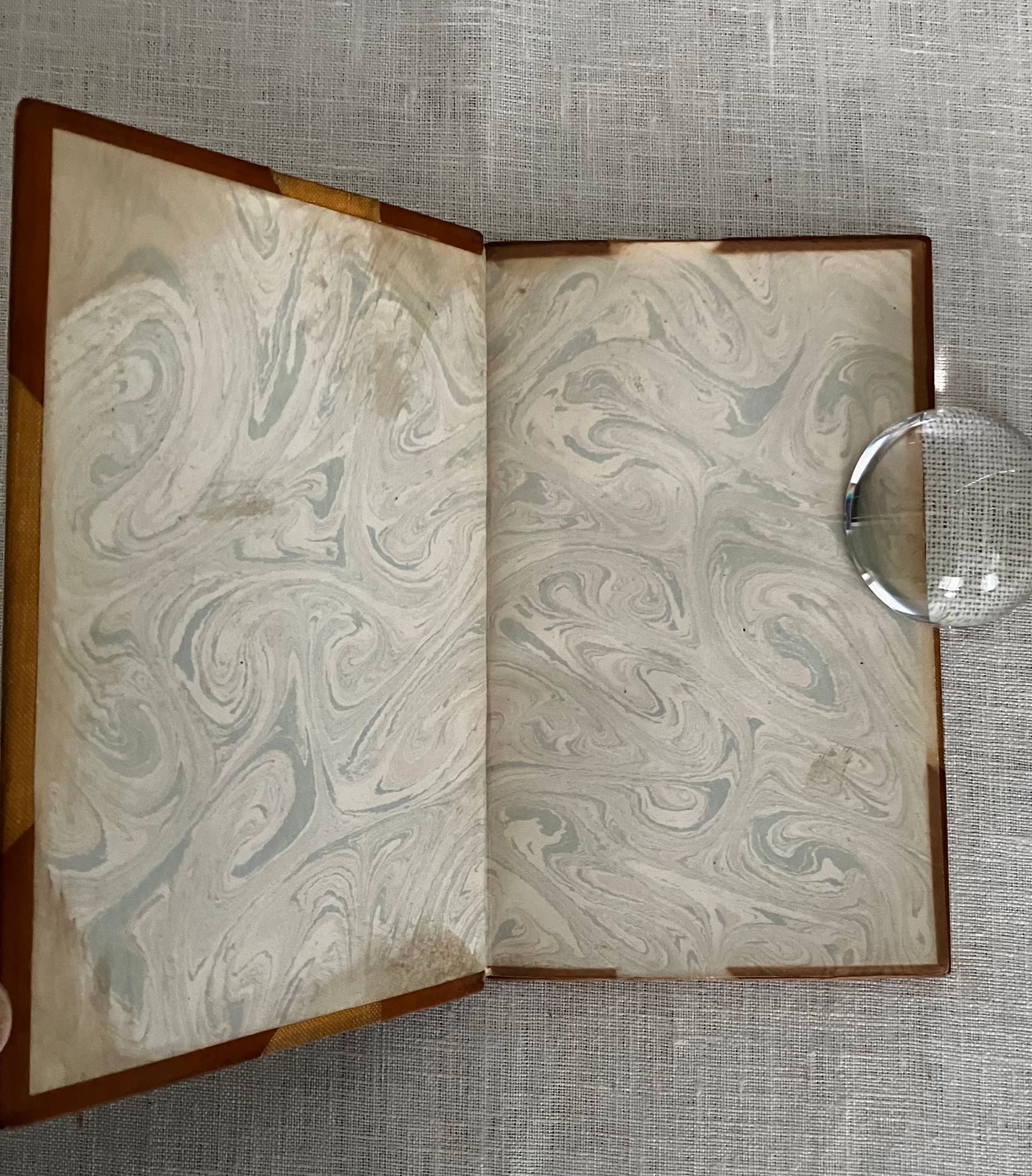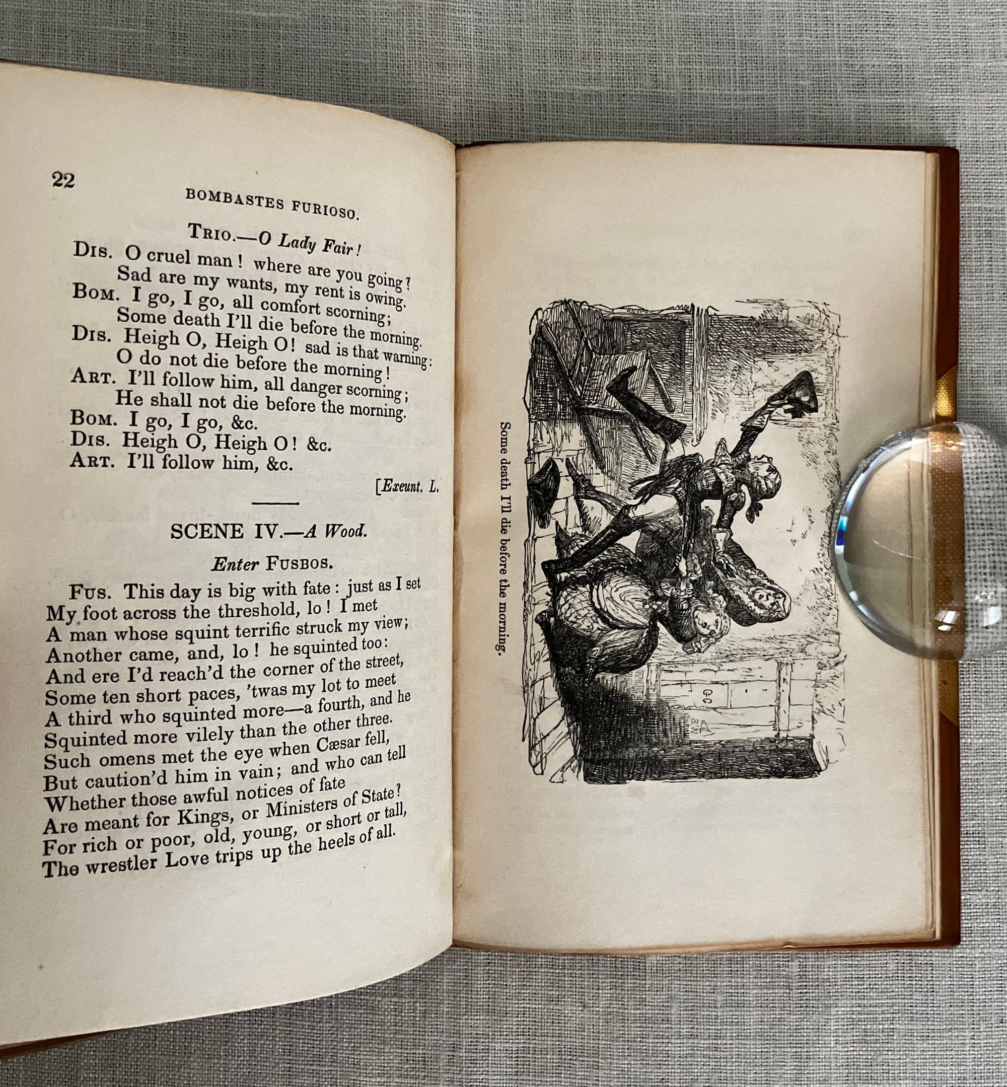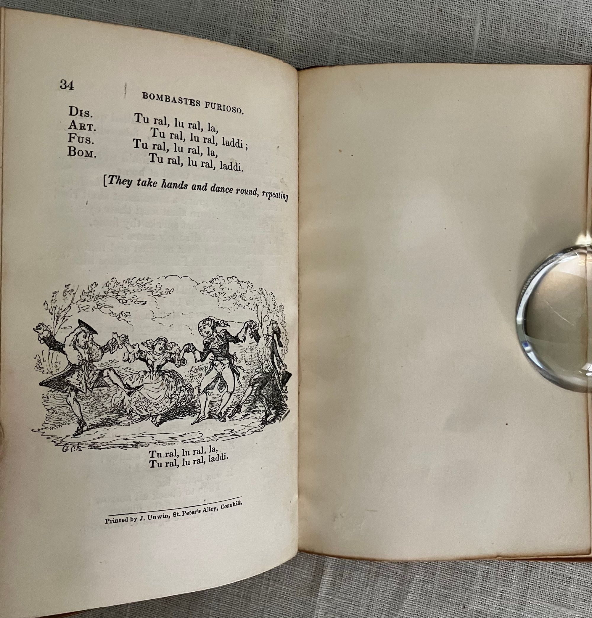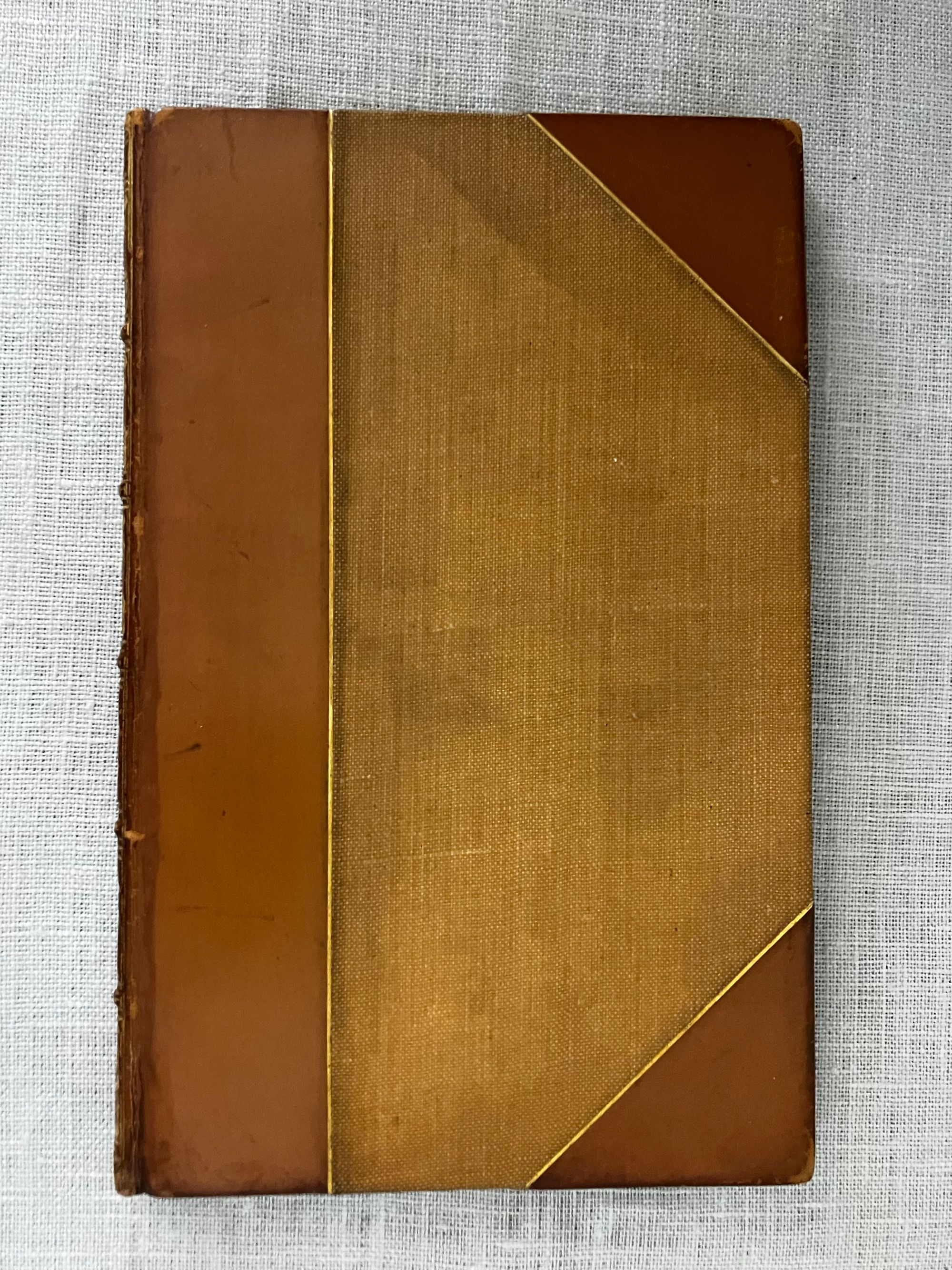 First Edition Thus. (First with the Cruikshank woodcut illustrations). Hard cover, 16 mo (4 x 6 3/8 inches), finely bound by Riviere & Sons, stamp signed to verso endpaper, in three-quarter calf with tan cloth-covered boards. Spine with six raised bands tooled with elaborate gilt decorations, all board edges ruled in gilt, a.e.g. The spine with six raised bands tooled with elaborate gilt decoration, and titles, [3] 34, [3] pp. Illustrated frontispiece plus five other full page wood engraved illustrations by renowned British illustrator George Cruikshank ((1792-1878) Also, with smaller vignette at title page and one at "fini". Printed by J. Unwin, St. Peter's Alley, Cornhill. CONDITION: Very Good. Slight soiling to cloth. Joints have light rubbing at head and tail of spine. Tips gently rubbed. Inside, hinges are in order and remains firmly bound. Old polish or glue? offset to the marbled endpapers, including at inside corners, browning some areas of the marbling. Text lightly age toned. Gilt remains bright. **A short, one-act burlesque, to which several songs were added, at least one of which was written by another author (see p. 14.) In the story, the King of Utopia, Artaxominous, holds court --in verse--with a ramshackle audience of functionaries, making light of any real issues of the day to concern himself rather with the romance of a young lady who is not his wife. A silly duel ensues. There is a dramatic death scene, and the stage erupts into song. Wildly popular by all accounts. This 1837 edition, was the first to use the Cruikshank engraved illustrations. Publisher Joseph Thomas was a stationer and news vendor in London's Cornhill; Simpkin and Marshall were publishers and book wholesalers during this period. The Introduction describes the career of the AUTHOR, W. B. Rhodes (1772-1826). After a stint working in an attorney's office, Rhodes was engaged as a teller at The Bank of England and collected large numbers of English plays. "Bombastes Furiouso" was his premier contribution to the genre, although he had several other published titles in a similarly humorous vein. The one-act play was first performed in London at the Haymarket on 7th August, 1810. The British Library has a playbill with the names of the actors listed in this publication on p.6: a Mr. Mathews, Mr. Taylor and Mr. Liston, performing at the Theatre Royal, Covent Garden, London on Jan. 11, 1814. (blplaybillsdotorg.) (AMJ)