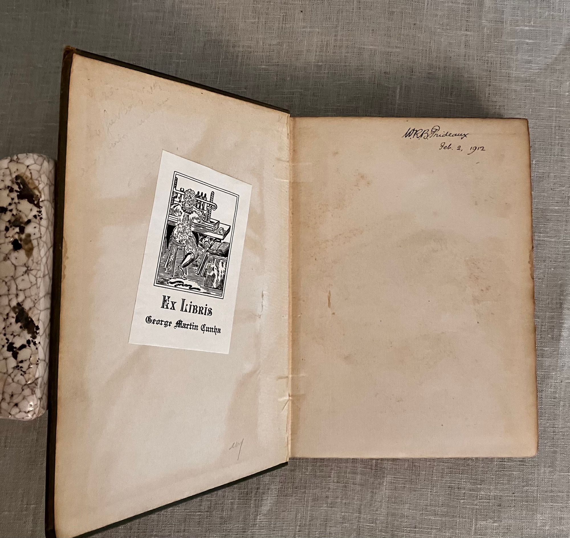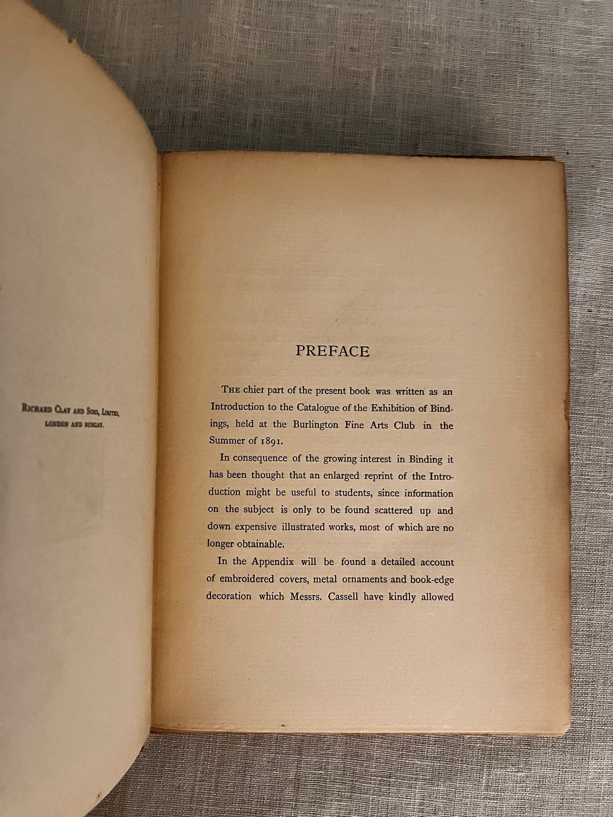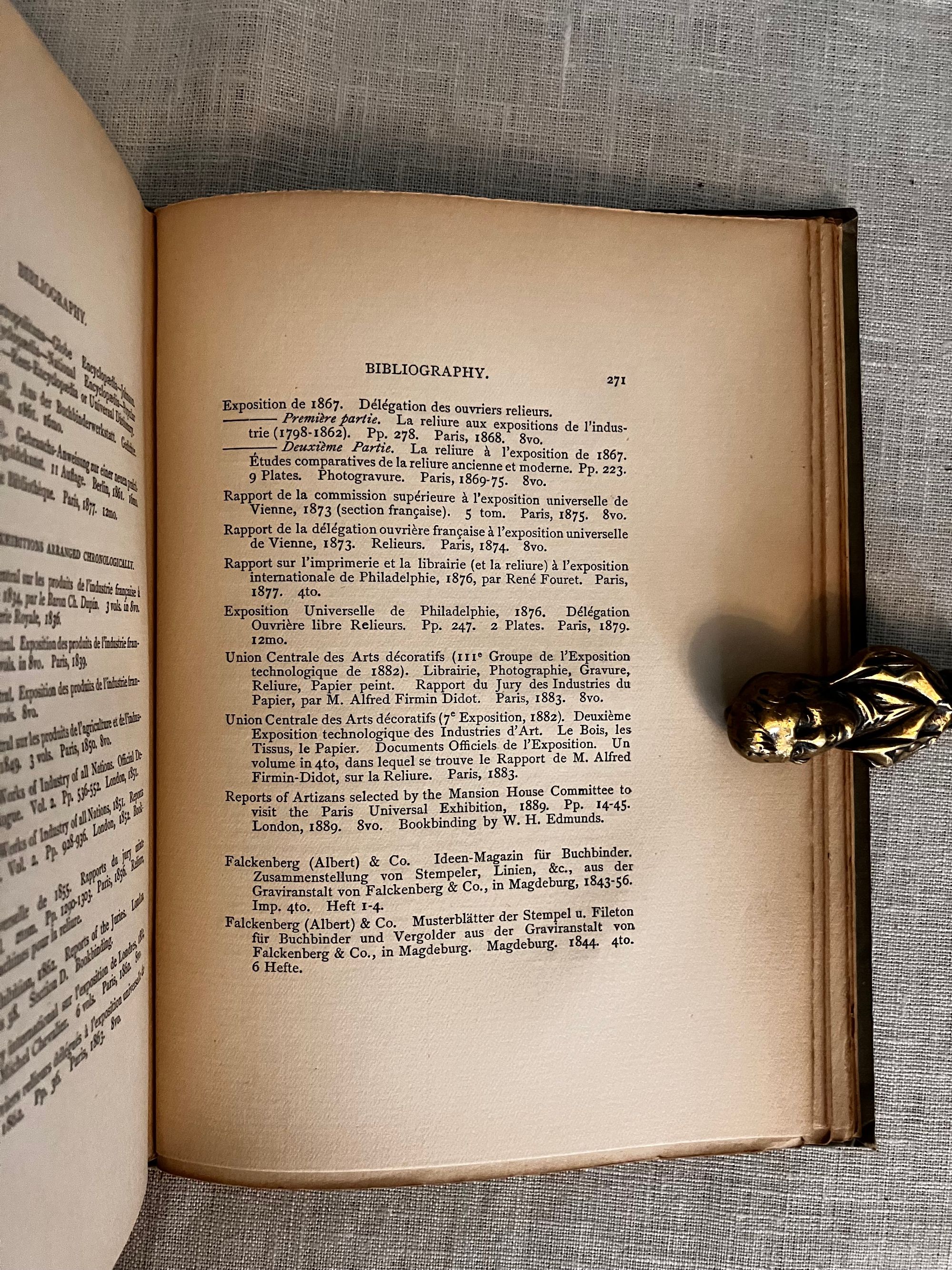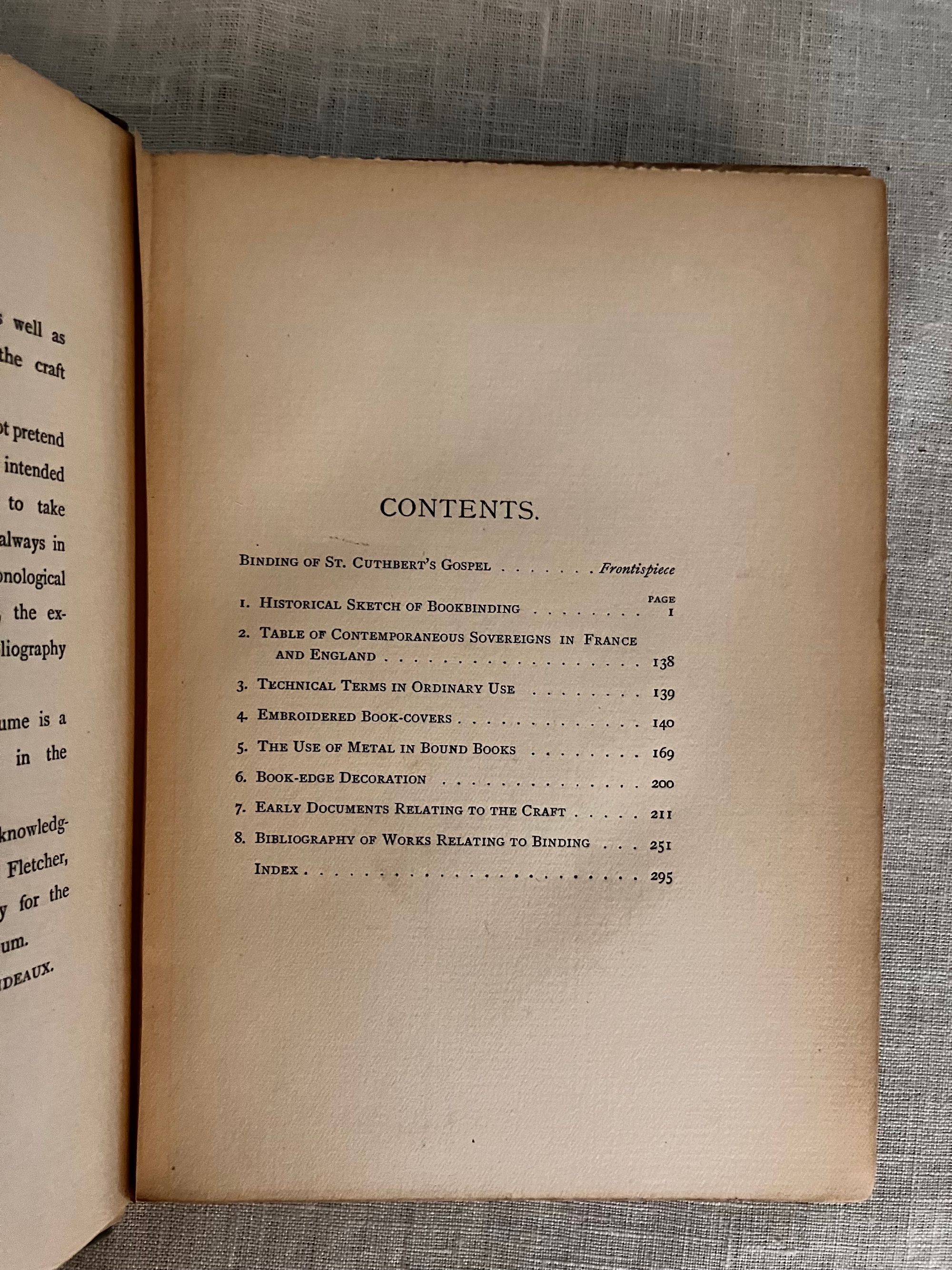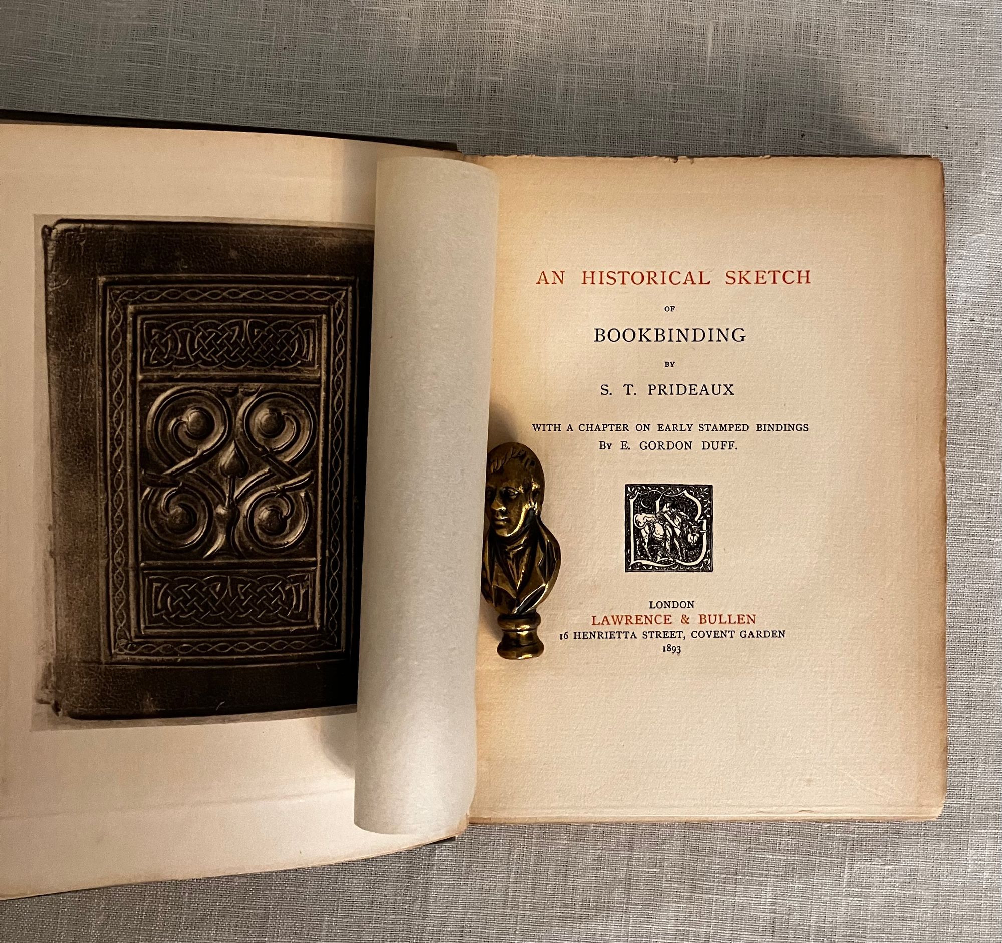 Hard cover, 8vo, in publisher's green cloth, with titles in gold blocked to the spine, tissue-guarded frontispiece halftone of St. Cuthbert's Gospel, 303 pp. Printed by Richard Clay and Sons, London and Bungay. **CONDITION: Very Good. Front hinge starting. Rear hinge cracked but holding firm. Some marks to rear board. Spine sunned, with gilt tiles faded, head beginning to fray. One small bubble front cover. Some pencil ticks and a few ink ticks within text. Moderately age toned. Former owner's name to ffep and bookplate to front endpaper; see interesting bookish provenance below. **A concise history describing the aspects of the bookbindings of Europe, and Great Britain from the Middle Ages through the early twentieth century, glossary of technical terms, chapter on embroidered bookbindings, and a selection of early documents relating to the craft. Also with extensive bibliography of books on the history of bookbinding. **AUTHOR, London-born bookbinder, book historian and first woman to teach bookbinding, SARAH TREVERBIAN PRIDEAUX (1853-1933) has long been considered one of the top practitioners of her craft in British women bookbinding circles of the Arts and Crafts era of the late nineteenth and early twentieth centuries. Briefly educated at Newnam College, Cambridge, she left to care for her ailing father, and pioneered this as a viable career for women. Her works are highly collectible artistic bindings, (some designed or finished by others,) which although not exhibited at British Arts and Crafts Society Exhibitions, were shown abroad at the Columbian World's Fair Exhibition in Chicago of 1893, and others shows. Her work is often mentioned among that of other skilled practitioners Katherine Adams and Sybil Pye, the former once her student. Her bookbindings are included in many institutional holdings. Her own binding of her personal copy of this book is illustrated in Fig. 59 of M. Tidcombe's Women Bookbinders 1880-1920), p. 106. See also S. T. Prideaux," A Catalogue of Books Bound by S. Prideaux" for illustrations of her work. (Bronxville, NY: N. Smith, 1979).** INTERESTING PROVENANCE: Signed by W.R.B. [William Reginald] B. Prideaux (1880-1932), British librarian associated with the Library of the Wellcome Collection in the mid 1920's. Also, Ex-Collection of George Martin Cunha, with his bookplate. Cuhna was also a librarian, and author, with his wife Dorothy, of "LIBRARY AND ARCHIVES CONSERVATION: 1980s AND BEYOND" (Metuchen, NJ: The Scarecrow Press, Inc., 1983.) (AMJ)