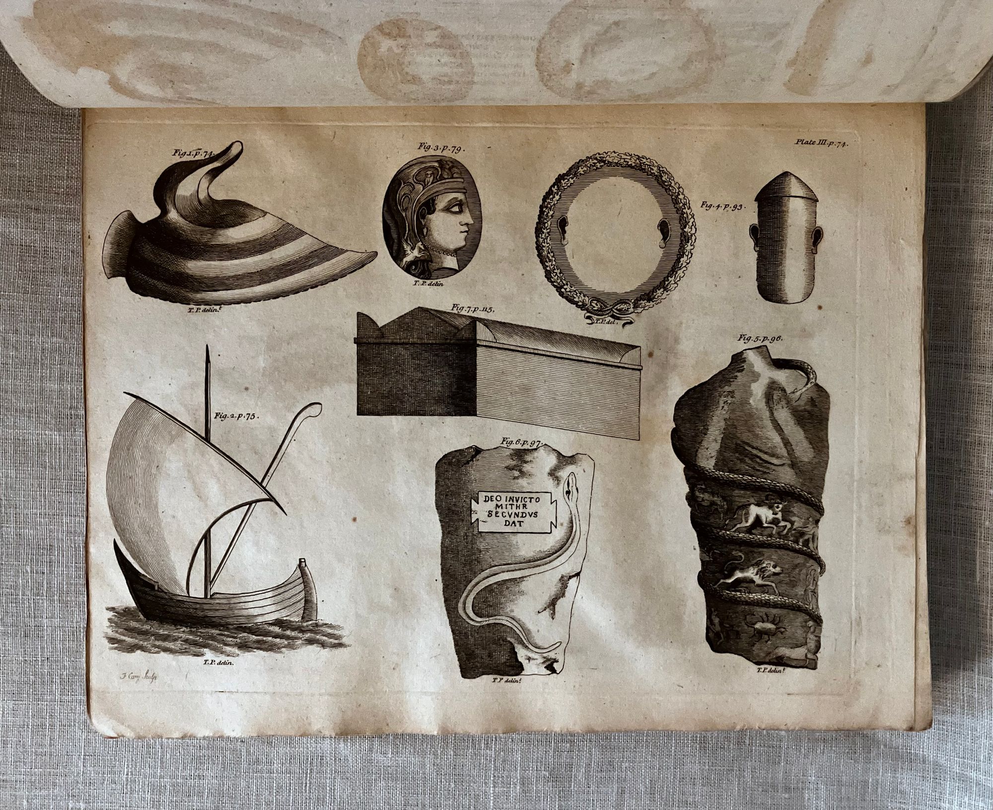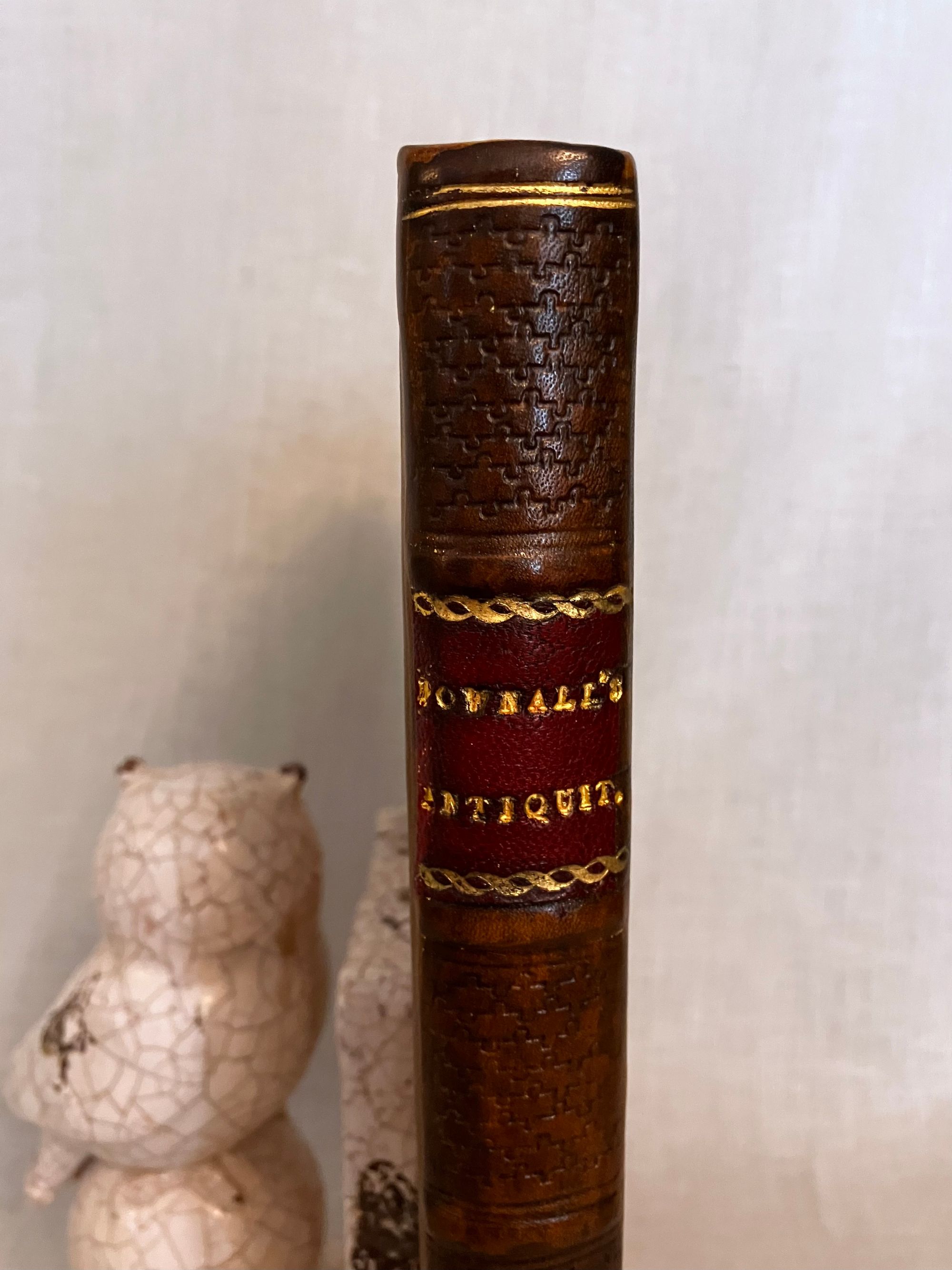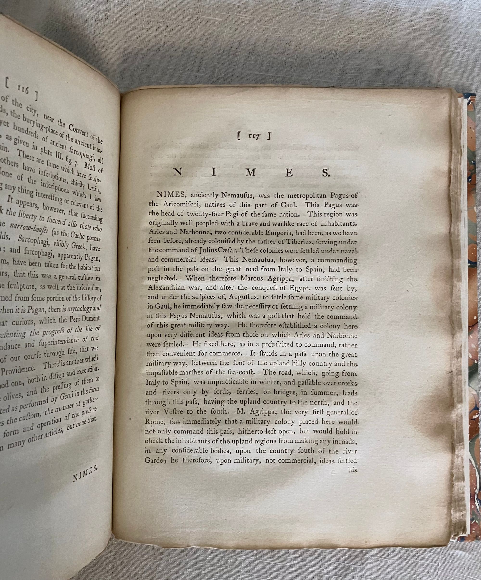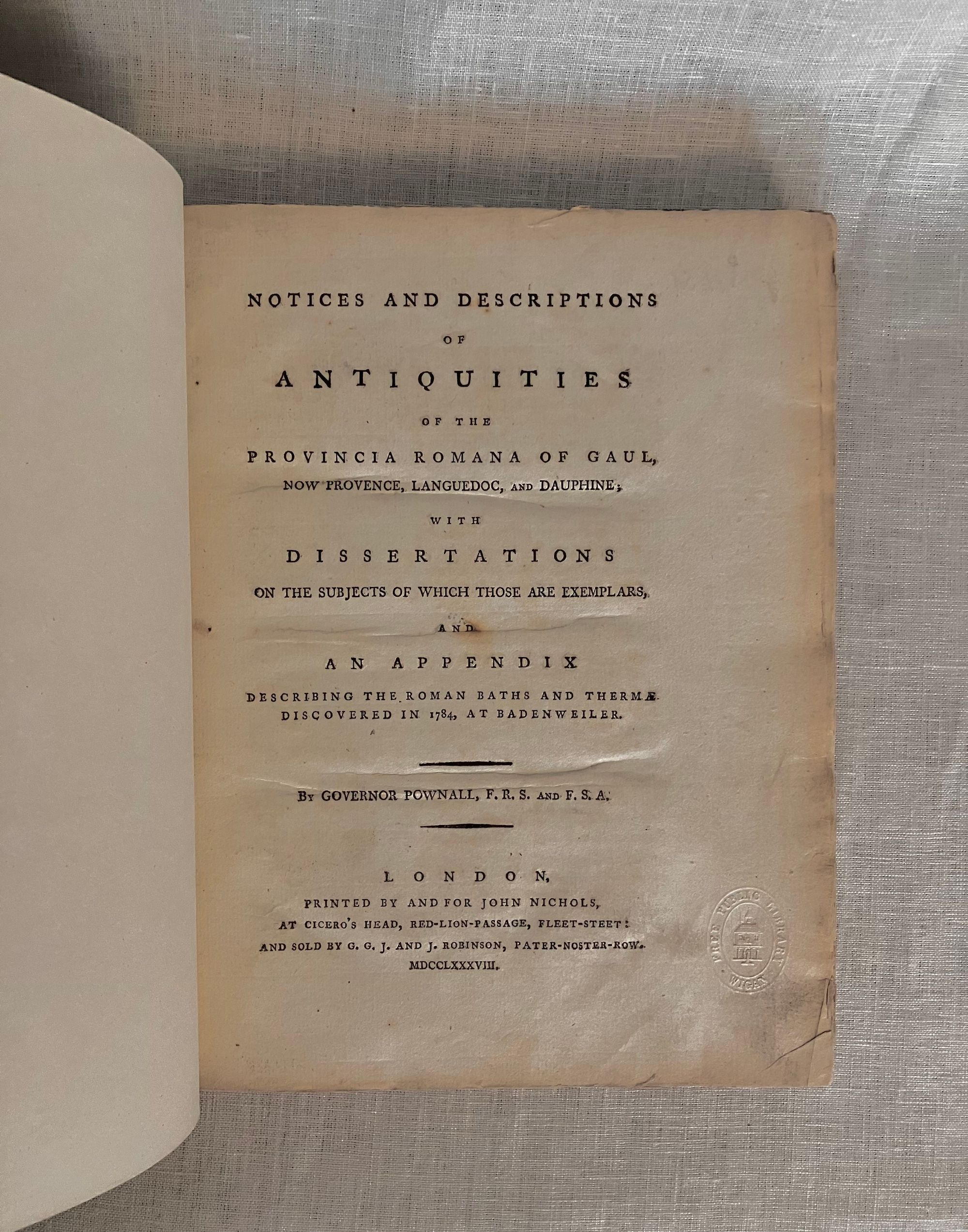 First Edition. Hard cover 4to, in a modern rebinding of half calf over marbled paper-covered boards, the spine with five raised bands, tooled in blind with a byzantine-like tessellated pattern, the title in gilt upon an onlaid red morocco label, new endpapers and fly leaves. Ex-library with two small blind stamps to lower corner title page and final page and related brief pencil notation to ffep. and verso title pg. [1],xii, plates I-VII,197, [1] pp. All original engraved full page plates are present. Pages untrimmed. With Errata page. **CONDITION: Overall Very Good antiquarian condition. Case is Near Fine, with a minute amount of rubbing to two front corners, otherwise no shelf wear. Small rubbing to one side of title label. Inside, hinges and joints are in order. Some pages show mild buckling. Moderate foxing to errata page. Finger soiling to title page, and some page edges a bit "dusty." Plate IV rubbed at bottom, (affecting scale indicator) A half inch open tear to foot of last page. Lightly age toned. **British AUTHOR and ARTIST Governor Thomas Pownall, F.R.S. and F.S.A. was a retired colonial American administrator, economist, parliamentarian and statesman who turned his attention in waning years to the study of Roman antiquities both in England and on the European continent. An amateur artist, he had his various sketches turned into the engraved plates shown here, drawing some of the newly discovered Roman ruins found at this time, and in consulting collections of like-minded connoisseurs. As a man of his times, his Cambridge education was replete with the classics, and he states his desire to plumb the poetical, artistic and historical references in this material for concrete examples to be be seen in the world around him, to correct defects in the faulty descriptions of others, and to enlighten the world to the rich historical record often hiding, unappreciated, in plain sight. To this end, he traveled to the aforementioned French and bordering Italian and Austrian provinces of ancient Gaul around 1783. Chapters are largely arranged by the cities he visited: Orange [Allobroges,] The "Delta of Gaul," being the Cottian Alps of Hannibal's march, Aix, Marseilles, the Glanum Livy (St. Remy de Provence), Crau, or Stony Plain around Lake Geneva, Arles, home of Roman ship building in the first century AD, Nîmes, Vienne (sic), Lyons and the newly discovered baths at Badenweiler. There are comments on local industries, arts , Roman belief systems, and natural science in this very readable compendium. **Of interest to the American reader, Governor Pownall (1722-1805) enjoys the historical reputation of being boldly sympathetic and actively pursuant of the rights of the American colonists against the repressive colonial administration of George III's government. He worked for the Board of Trade before promotion to posts in the Colonial governments of New York and New Jersey, becoming Governor of Massachusetts Bay Colony in 1857. He wrote several important books on the colonial administration, was a friend of Benjamin Franklin, criticized the Navigation Acts, the Quartering Act and other matters of taxation without representation, all issues leading up to the American Revolution of 1776. His influence on American affairs is nicely outlined at The Colonial Society of Massachusetts. USTC lists only five copies held worldwide; Worldcat lists only one, 504725812. Rare to market. (AMJ)