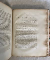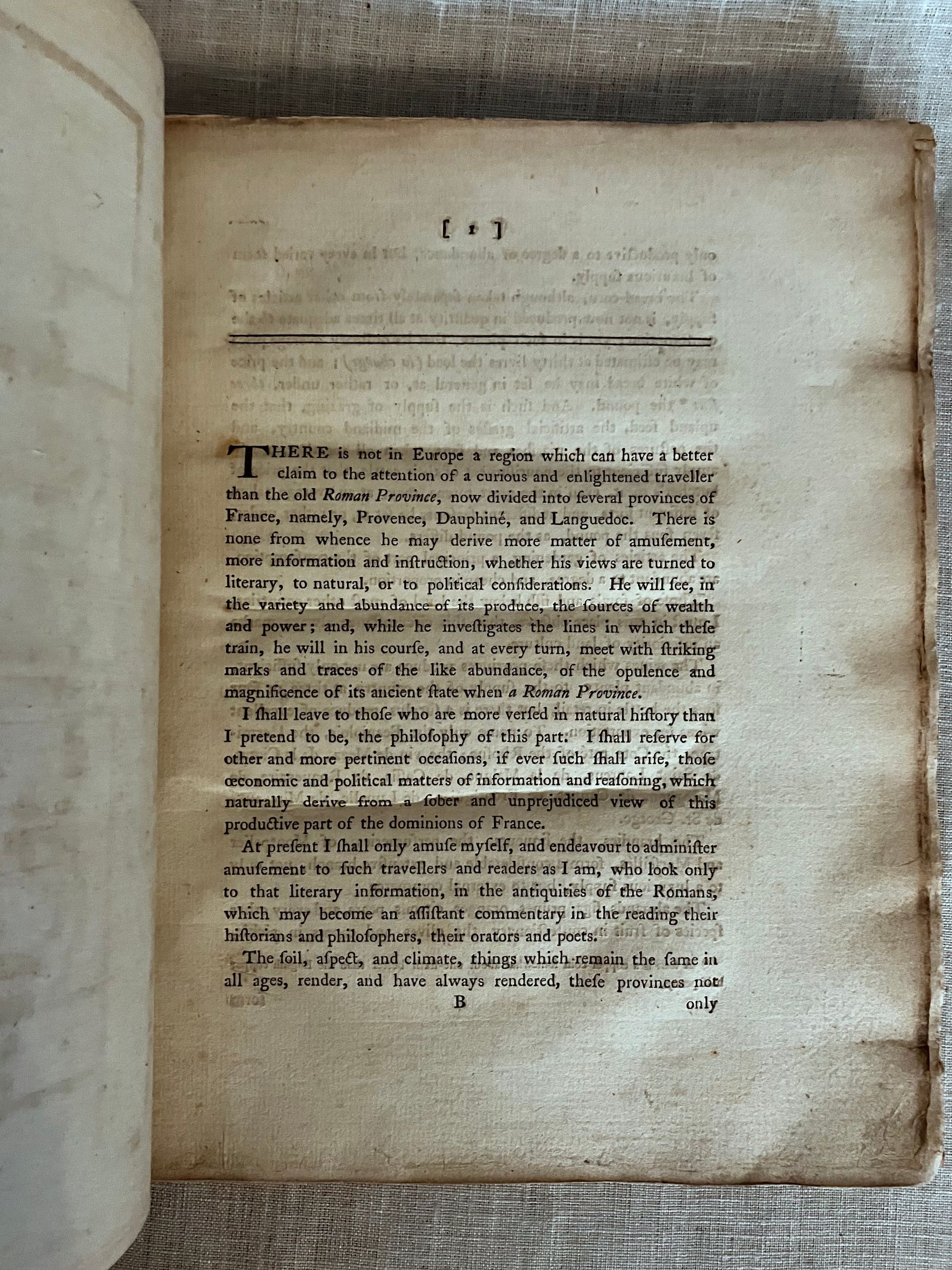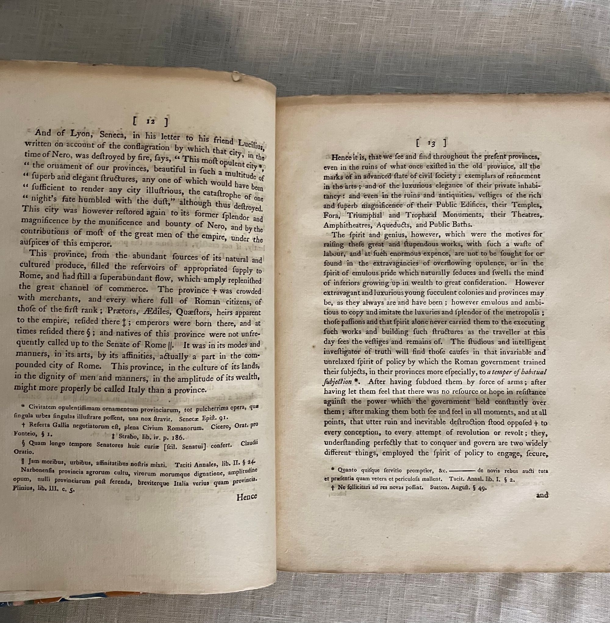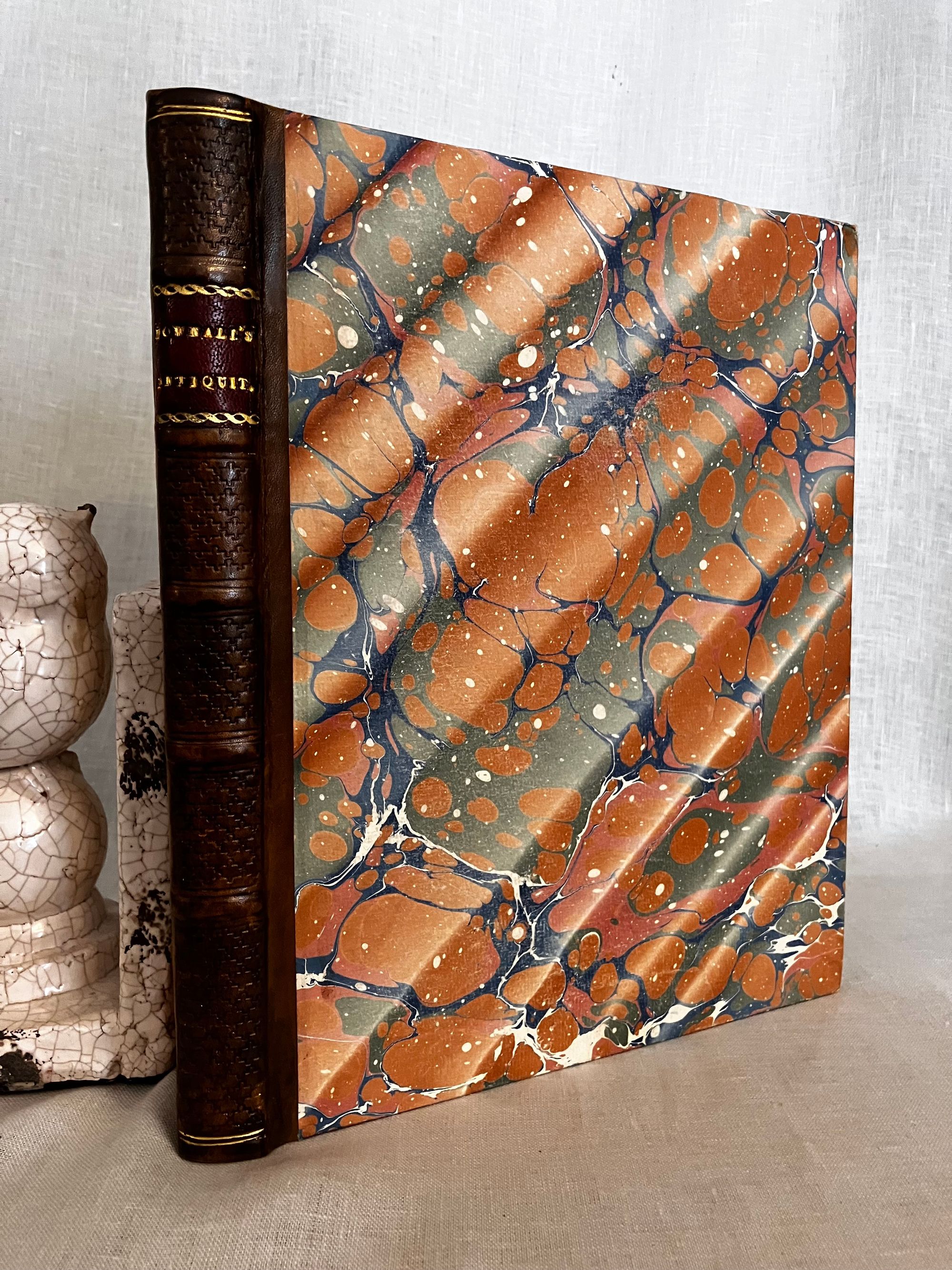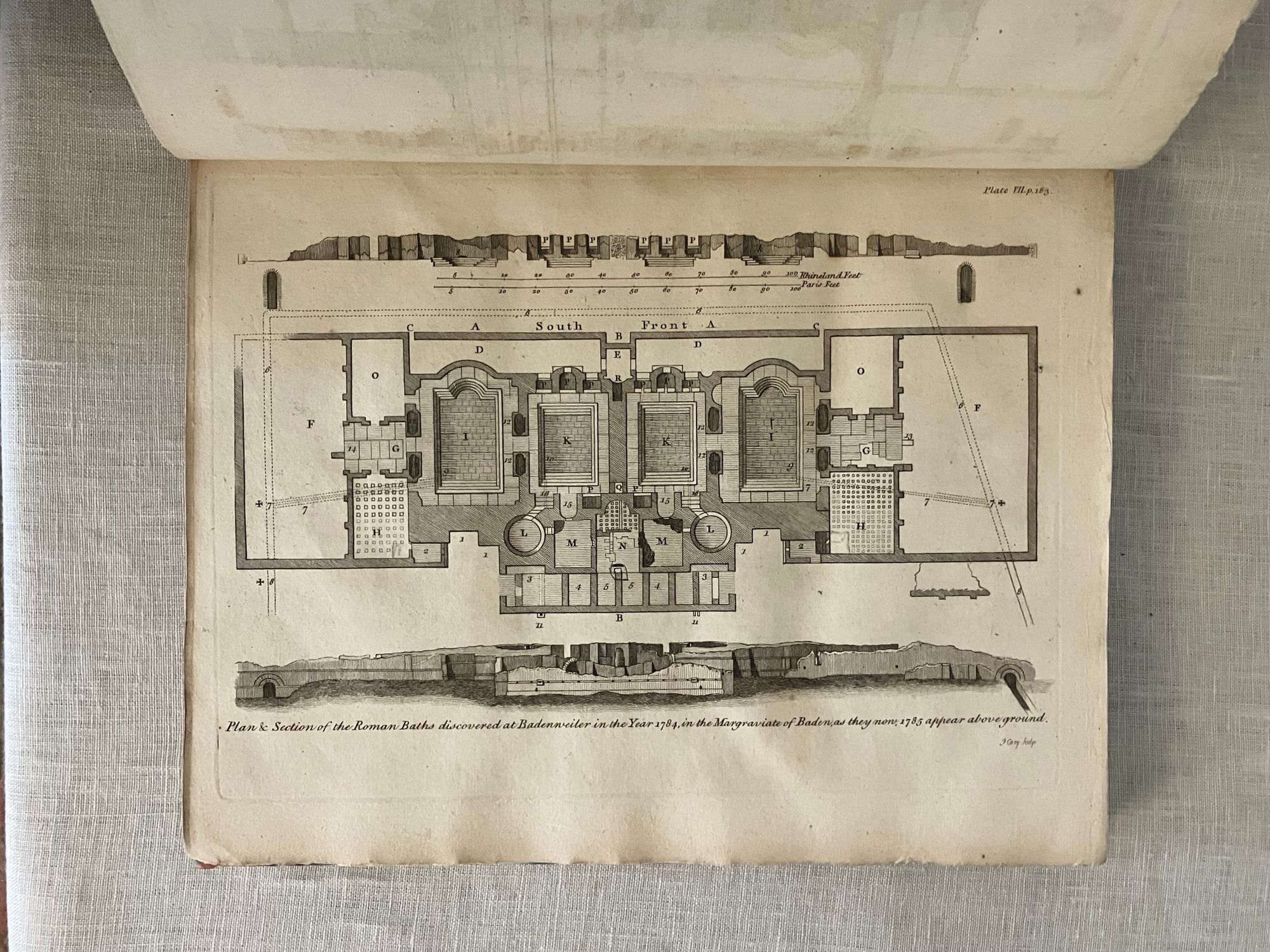 First Edition. Hard cover 4to, in a modern rebinding of half calf over marbled paper-covered boards, the spine with five raised bands, tooled in blind with a byzantine-like tessellated pattern, the title in gilt upon an onlaid red morocco label, new endpapers and fly leaves. Ex-library with two small blind stamps to lower corner title page and final page and related brief pencil notation to ffep. and verso title pg. [1],xii, plates I-VII,197, [1] pp. All original engraved full page plates are present. Pages untrimmed. With Errata page. **CONDITION: Overall Very Good antiquarian condition. Case is Near Fine, with a minute amount of rubbing to two front corners, otherwise no shelf wear. Small rubbing to one side of title label. Inside, hinges and joints are in order. Some pages show mild buckling. Moderate foxing to errata page. Finger soiling to title page, and some page edges a bit "dusty." Plate IV rubbed at bottom, (affecting scale indicator) A half inch open tear to foot of last page. Lightly age toned. **British AUTHOR and ARTIST Governor Thomas Pownall, F.R.S. and F.S.A. was a retired colonial American administrator, economist, parliamentarian and statesman who turned his attention in waning years to the study of Roman antiquities both in England and on the European continent. An amateur artist, he had his various sketches turned into the engraved plates shown here, drawing some of the newly discovered Roman ruins found at this time, and in consulting collections of like-minded connoisseurs. As a man of his times, his Cambridge education was replete with the classics, and he states his desire to plumb the poetical, artistic and historical references in this material for concrete examples to be be seen in the world around him, to correct defects in the faulty descriptions of others, and to enlighten the world to the rich historical record often hiding, unappreciated, in plain sight. To this end, he traveled to the aforementioned French and bordering Italian and Austrian provinces of ancient Gaul around 1783. Chapters are largely arranged by the cities he visited: Orange [Allobroges,] The "Delta of Gaul," being the Cottian Alps of Hannibal's march, Aix, Marseilles, the Glanum Livy (St. Remy de Provence), Crau, or Stony Plain around Lake Geneva, Arles, home of Roman ship building in the first century AD, Nîmes, Vienne (sic), Lyons and the newly discovered baths at Badenweiler. There are comments on local industries, arts , Roman belief systems, and natural science in this very readable compendium. **Of interest to the American reader, Governor Pownall (1722-1805) enjoys the historical reputation of being boldly sympathetic and actively pursuant of the rights of the American colonists against the repressive colonial administration of George III's government. He worked for the Board of Trade before promotion to posts in the Colonial governments of New York and New Jersey, becoming Governor of Massachusetts Bay Colony in 1857. He wrote several important books on the colonial administration, was a friend of Benjamin Franklin, criticized the Navigation Acts, the Quartering Act and other matters of taxation without representation, all issues leading up to the American Revolution of 1776. His influence on American affairs is nicely outlined at The Colonial Society of Massachusetts. USTC lists only five copies held worldwide; Worldcat lists only one, 504725812. Rare to market. (AMJ)